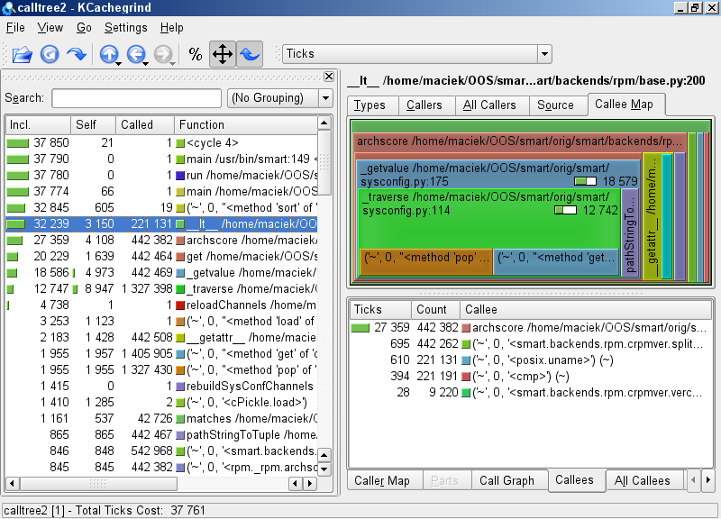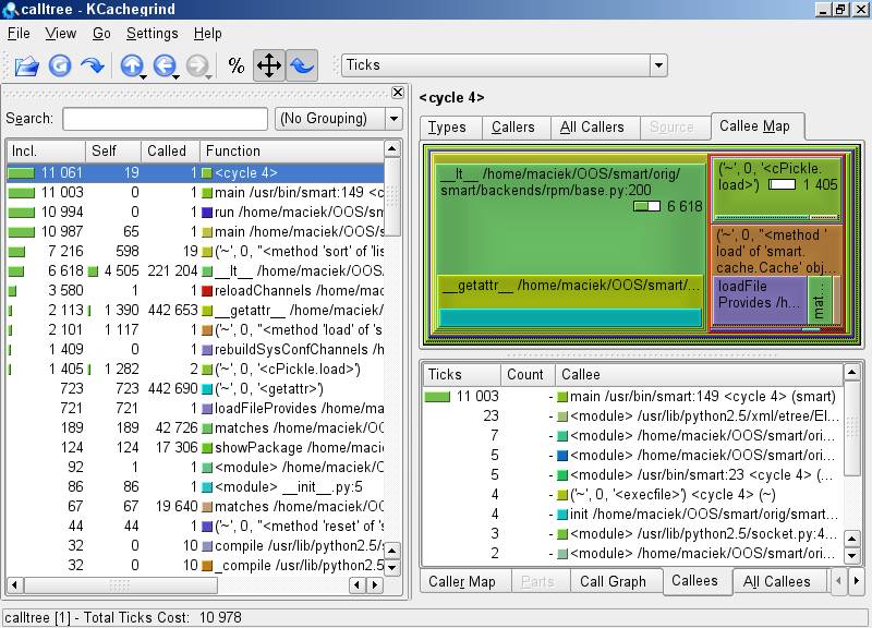 PYTHONPATH=/home/maciek/OOS/smart/working:$PYTHONPATH lsprofcalltree.py -o /tmp/calltree `which smart` <smart options>; kcachegrind /tmp/calltree